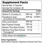 A synergistic formula of Vitamin C, Pantothenic Acid, Olive leaf extract, and other natural extracts, Zahler Immune Defense provides powerful nutritional support for a healthy immune system and general wellness. Immune Defense should preferably be taken daily during times of seasonal change.